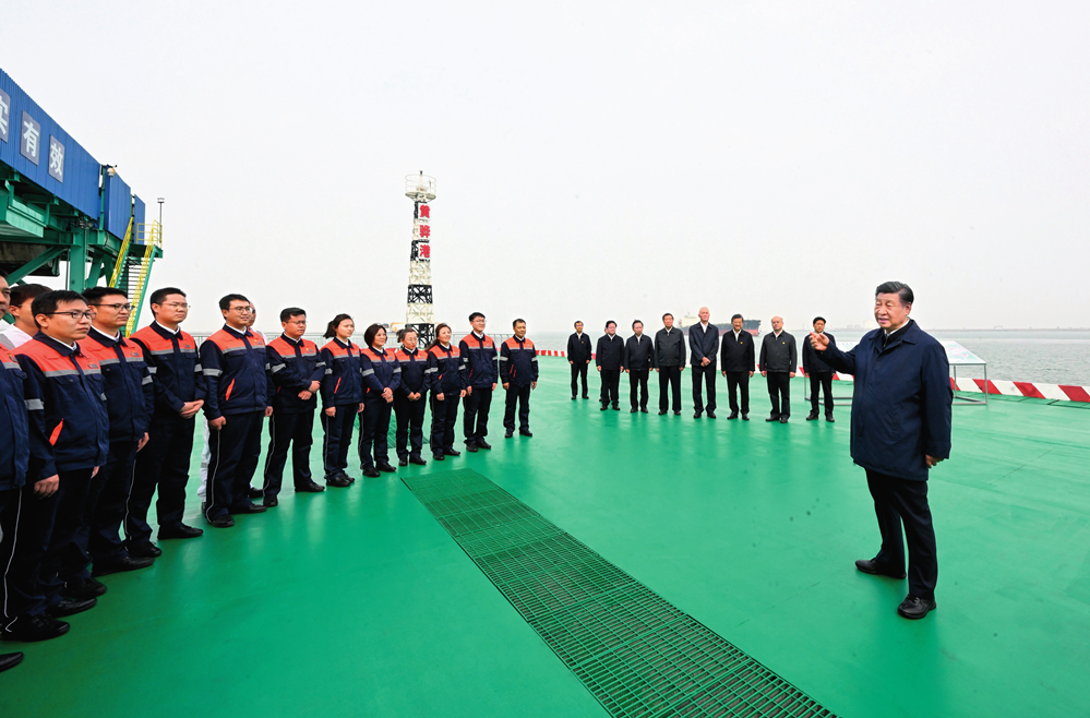 5月11日至12日,中共中央总书记、国家主席、中央军委主席习近平在河北考察,并主持召开深入推进京津冀协同发展座谈会。这是11日下午,习近平在沧州市黄骅港煤炭港区码头考察时,同码头工作人员、船务人员亲切交流 李学仁摄/本刊