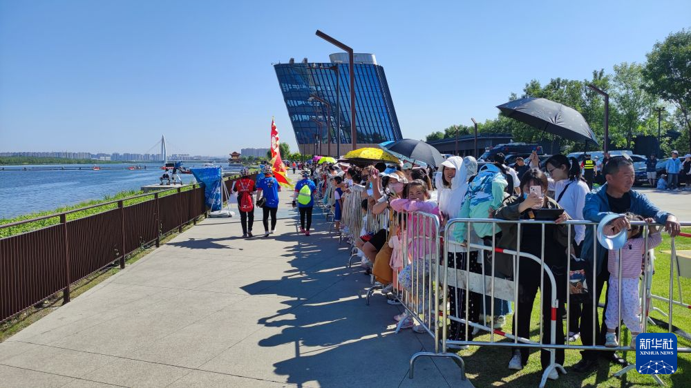 一个微胖的背影站在阴影里,骑行服的背后印着“骑游协会”四个字,显示这个协会成员的爱好——骑行和游泳。六十多岁的冷富武和妻子都在这个协会里,夫妻俩曾经向南沿着京杭大运河骑行到达杭州,也向北到过漠河。这次龙舟赛冷富武也组队参加,妻子是队员,队伍名字叫“夕阳红”。他们刚结束上午的训练,准备骑车回家。