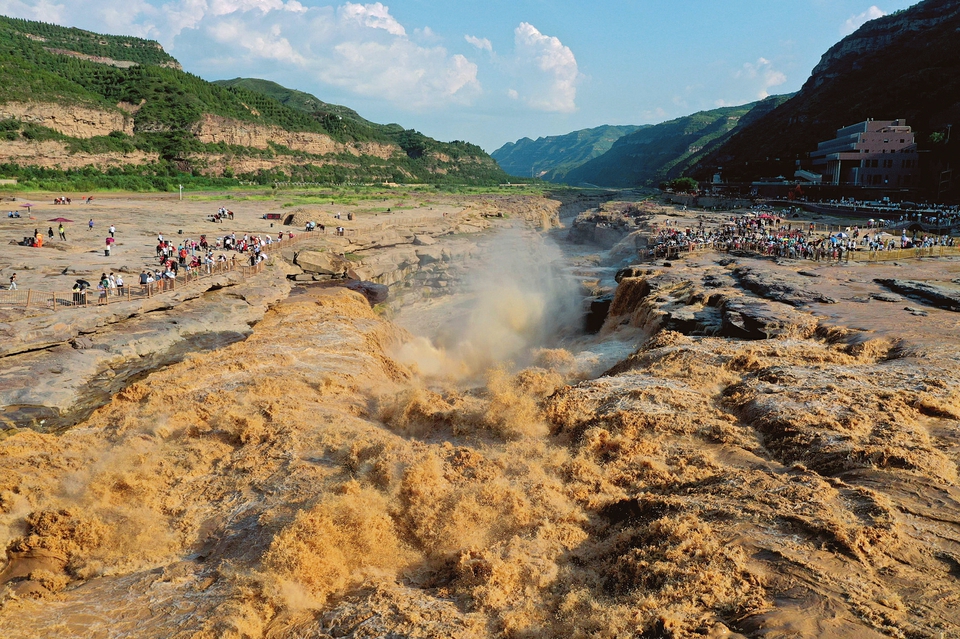 6月29日,游客在吉县黄河壶口瀑布游览观瀑。近日,受黄河干流晋陕峡谷强降雨天气影响,吉县壶口瀑布水量增加,河水颜色由清变浊,再现“大河流金”景观,吸引了众多游客。(吕桂明摄)