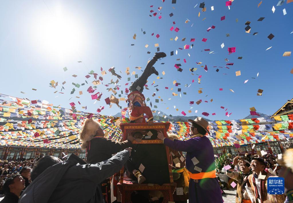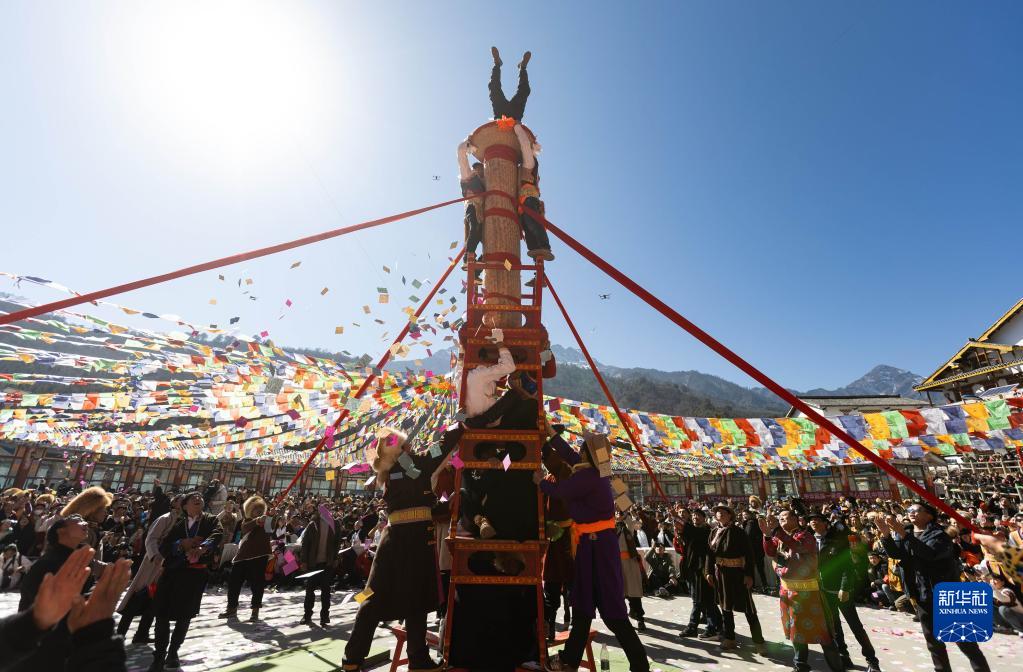 1月30日,当地藏族群众表演传统民俗杂技“天鹅抱蛋”。