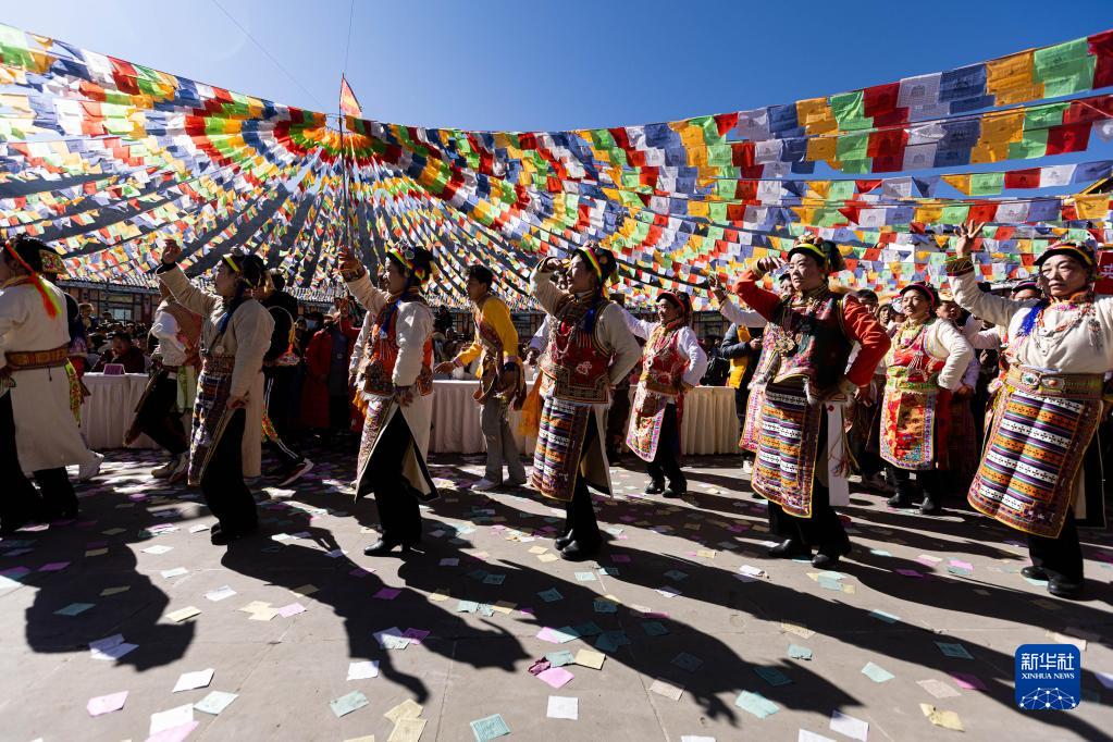 1月30日,身着盛装的藏族群众跳着欢快的锅庄。