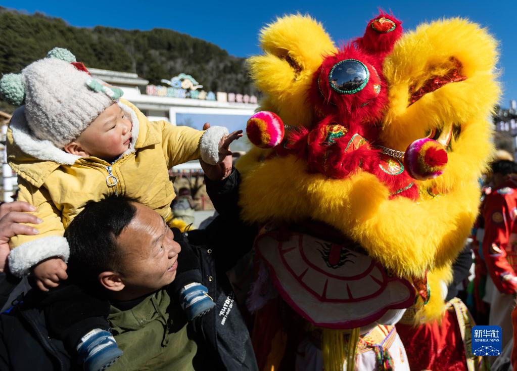1月30日,骑在家长背上的小朋友好奇地触摸“狮子头”。