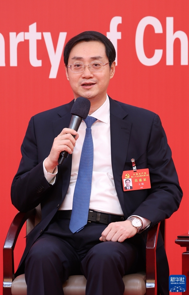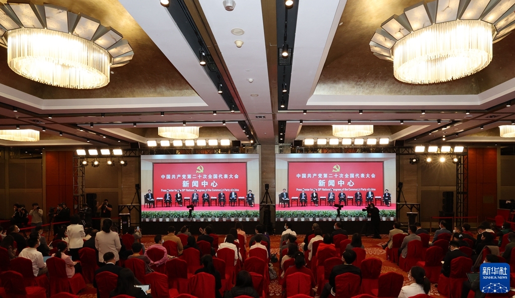 10月19日,中国共产党第二十次全国代表大会新闻中心举行集体采访。重庆、四川、贵州、云南、西藏、陕西、甘肃代表团新闻发言人出席,介绍代表团学习讨论二十大报告情况,并回答记者提问。新华社记者 陈建力 摄